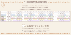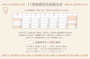 11月2日(日)、3日(月・祝)、9日(日)、23日(日)、24日(月・祝)は休診日となります。
